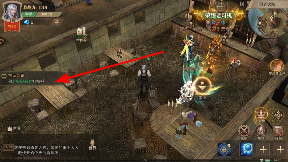 2、勇者大陸等場景,會有諸如和老板娘雅莉打招呼這類任務(wù),與指定NPC互動完成任務(wù),可獲取經(jīng)驗(yàn)、道具等獎勵,推動角色成長。