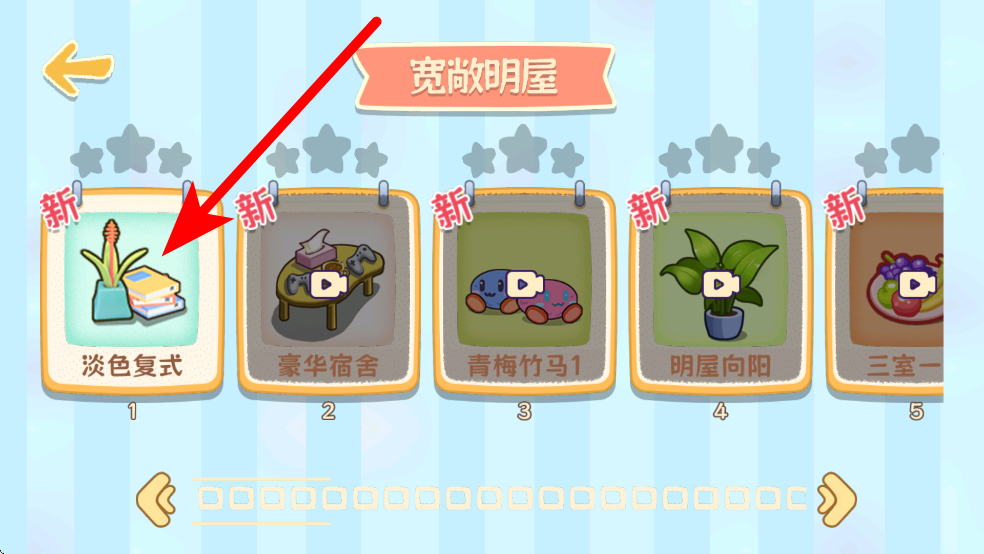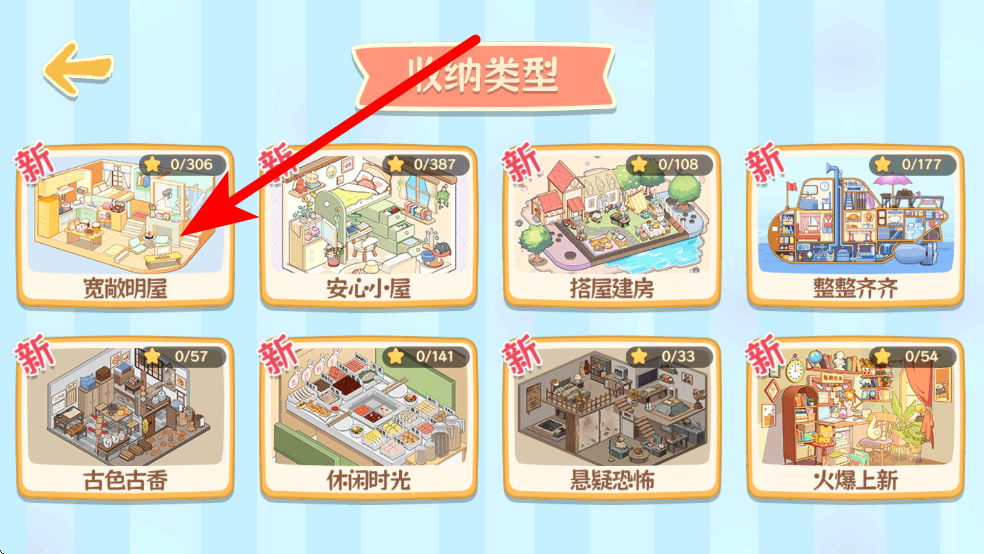 1、進入游戲,會看到多種收納類型選項,如寬敞明屋、安心小屋等,玩家可根據(jù)喜好選擇其中一個收納類型,進入對應的收納場景。