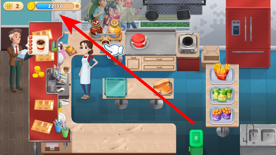 4、制作完成的美食要及時送到顧客手中,完成訂單后能獲得金幣獎勵,留意左上金幣條,金幣可用于解鎖新食材、升級廚具,提升餐廳的制作能力。