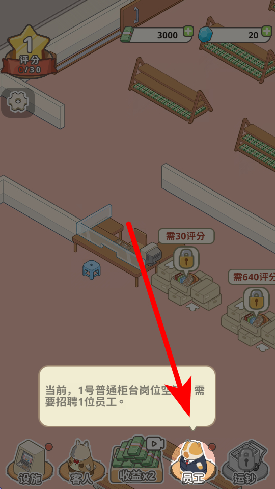 1、若柜臺(tái)崗位空缺,可點(diǎn)擊下方員工按鈕,進(jìn)入員工界面后,能看到可招聘的員工,滿足評(píng)分等條件時(shí),點(diǎn)擊招聘即可為店鋪增添員工,助力業(yè)務(wù)開(kāi)展。