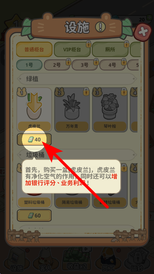 3、進(jìn)入設(shè)施界面,能看到各類設(shè)施,像綠植類的虎皮蘭,花費(fèi)相應(yīng)貨幣購(gòu)買后,它可凈化空氣,還能增加銀行評(píng)分、業(yè)務(wù)利潤(rùn),提升店鋪整體效益。