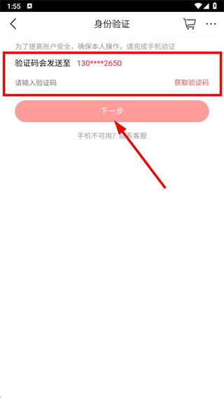 5、接著在身份驗(yàn)證頁面獲取并輸入原手機(jī)號(hào)的驗(yàn)證碼,點(diǎn)擊下一步,按照提示完成新手機(jī)號(hào)的綁定。