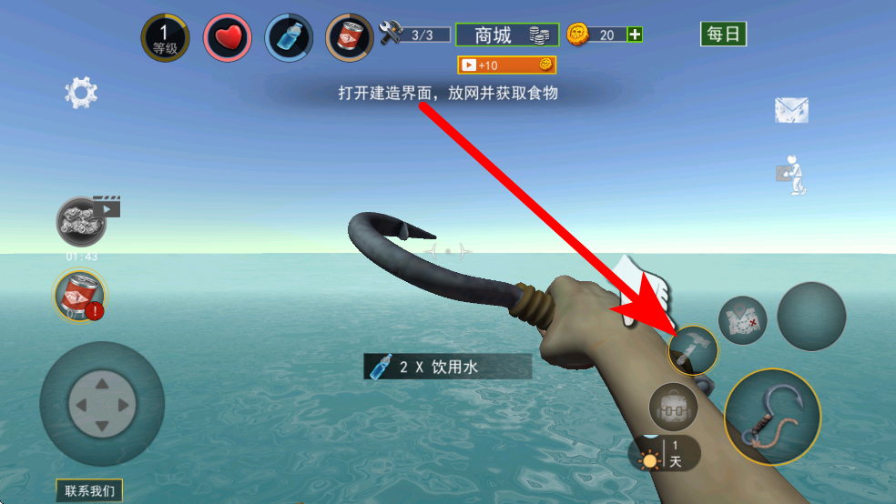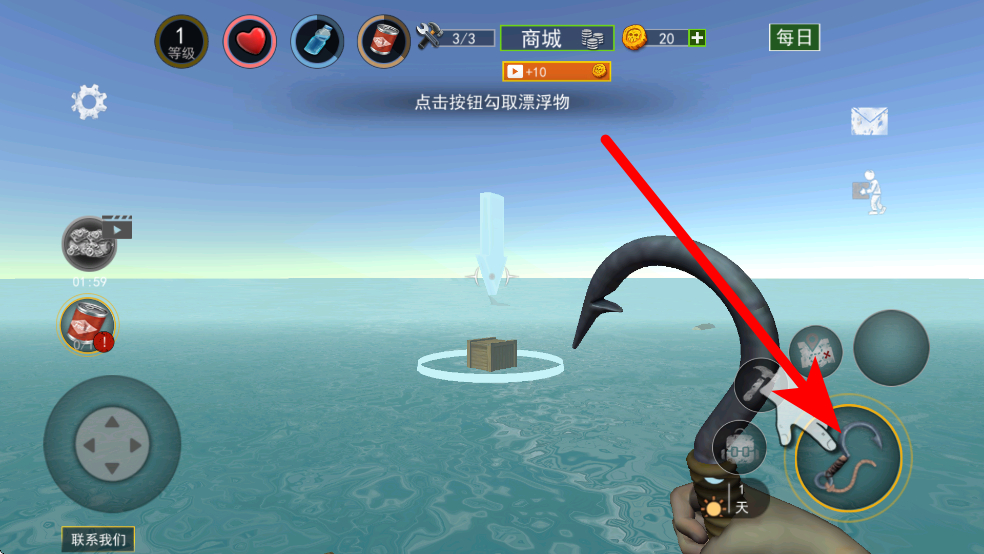 1、進(jìn)入后,可借助鉤子勾取海上漂浮物,這些漂浮物能提供木板、繩子等初始資源,是后續(xù)建造與生存的根基,要及時勾取來積累物資。