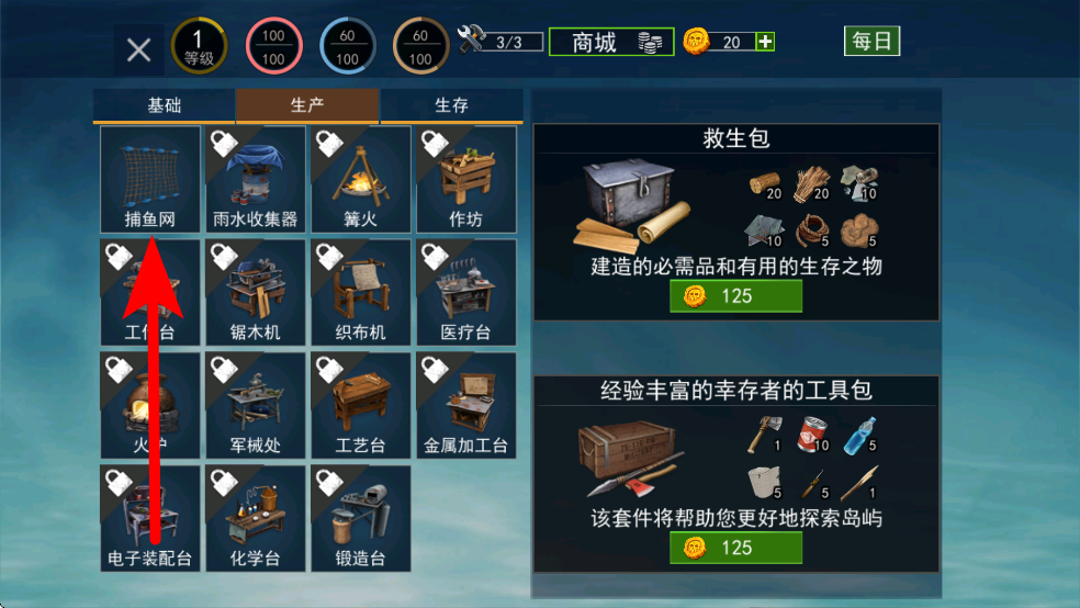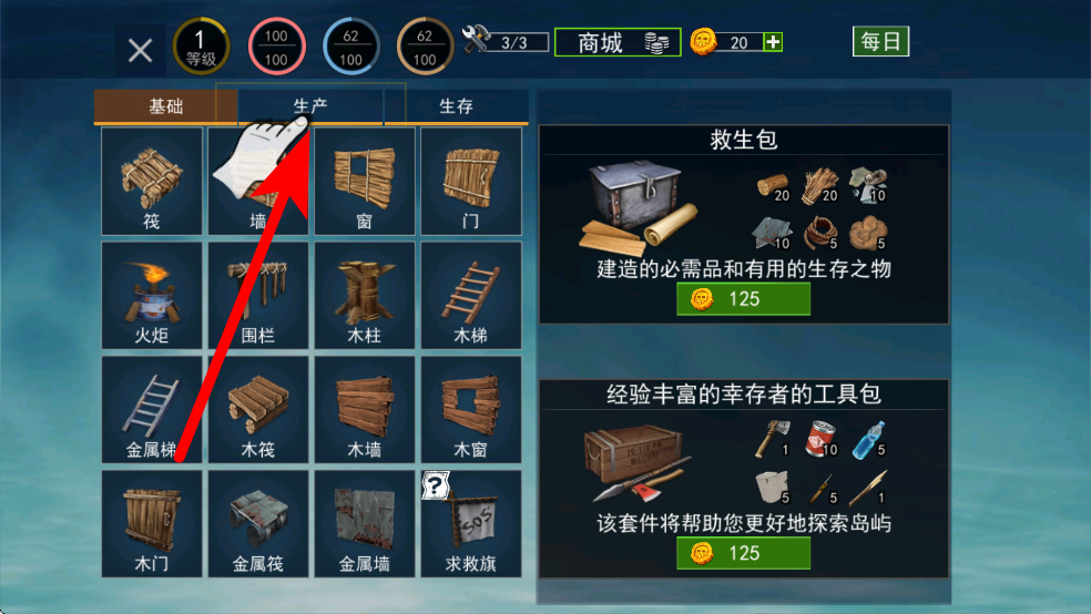 3、若有生產(chǎn)需求,可前往商城,花費(fèi)金幣購買生產(chǎn)的道具,生產(chǎn)工具能為生存與建造提供助力。