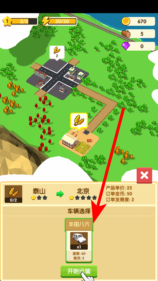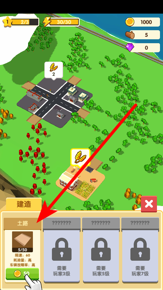 1、進(jìn)入建造界面,可選擇建造土路,花費(fèi)一定金幣就能建造,土路有相應(yīng)的限速、耗油量和車輛故障率等屬性,為后續(xù)運(yùn)輸鋪路。