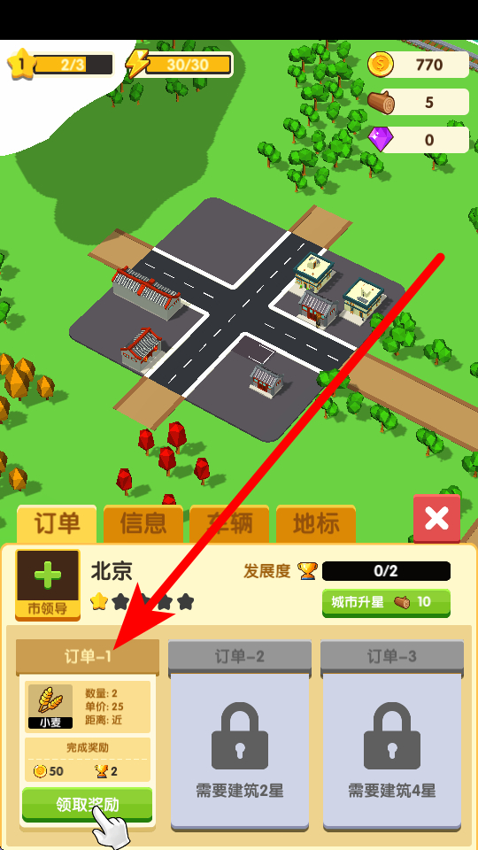 4、完成運(yùn)輸訂單后,進(jìn)入訂單界面,找到已完成的訂單,點(diǎn)擊領(lǐng)取獎勵,能獲得金幣等獎勵,這些獎勵可用于城市建設(shè)等,提升城市發(fā)展度。