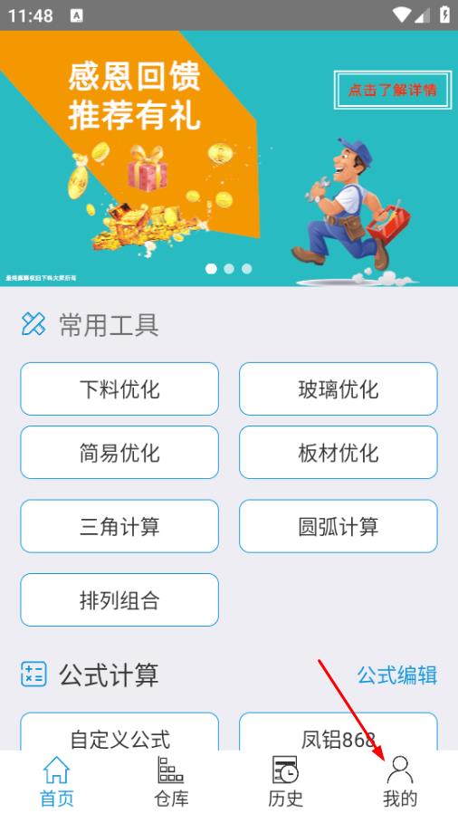 1、打開下料優(yōu)化大師,點(diǎn)擊頁面右下角的我的,進(jìn)入個人頁面。