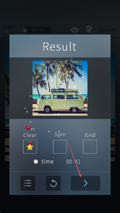 4、完成拼圖出現(xiàn)Result界面,查看獎(jiǎng)勵(lì),點(diǎn)擊下方箭頭按鈕進(jìn)入下一關(guān)。