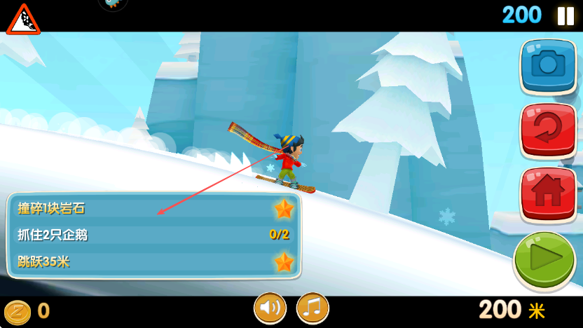 1、進(jìn)入游戲查看左側(cè)任務(wù)欄,明確撞碎1塊巖石,抓住2只企鵝,跳躍35米等目標(biāo)。