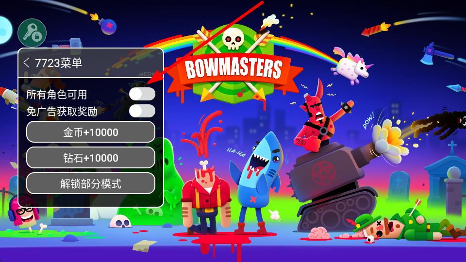 1、在游戲菜單界面,可根據(jù)需求開(kāi)啟所有角色可用免廣告獲取獎(jiǎng)勵(lì)功能,還能領(lǐng)取金幣、獎(jiǎng)勵(lì)及解鎖部分模式。
