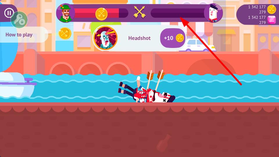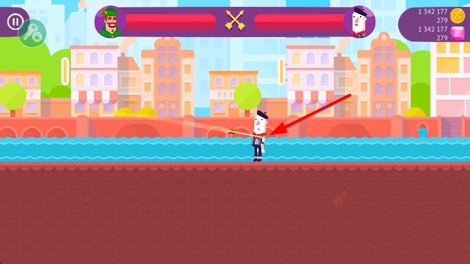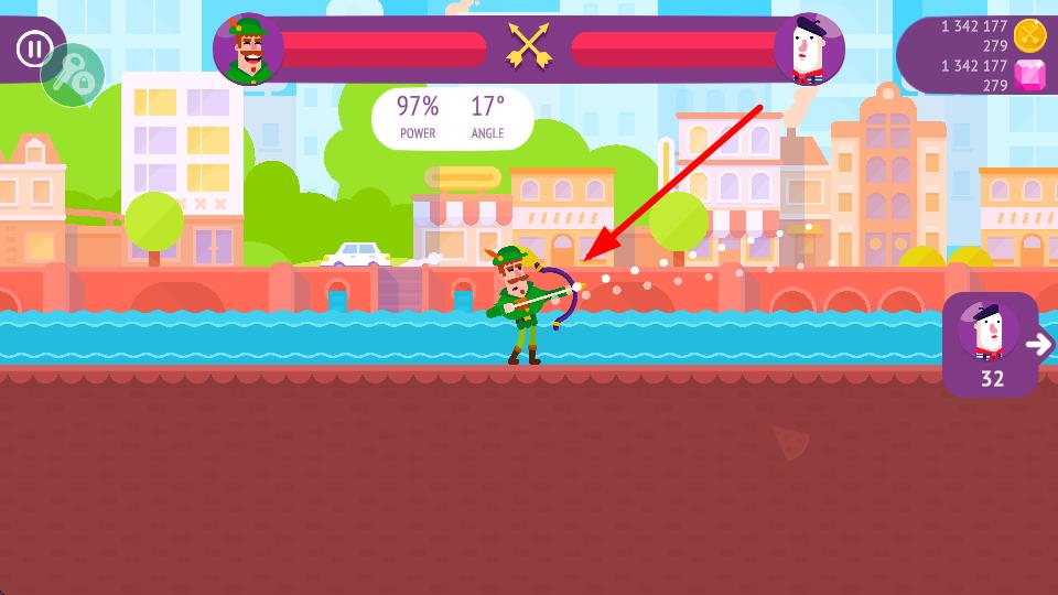 2、戰(zhàn)斗時(shí),操控角色調(diào)整弓箭的力度和角度,按照箭頭指引發(fā)射弓箭,攻擊對(duì)手,精準(zhǔn)把控力度角度提高命中。