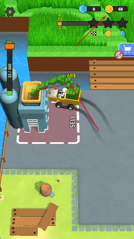 3、收割的作物會被收集到車輛的車廂中,裝滿后將車輛駕駛到SELL區(qū)域,出售作物獲取金幣。