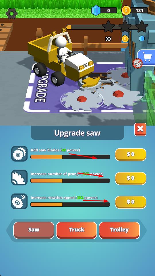 4、積累足夠金幣后,可前往UPGRADE區(qū)域,對切割裝置、卡車、手推車等進行升級。