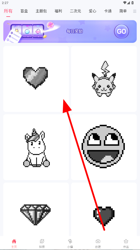 1、首先在圖案選擇界面,有多種像素風(fēng)格的圖案可供挑選,選中心儀的圖案,即可開啟填色創(chuàng)作之旅,為后續(xù)填色做好準(zhǔn)備。