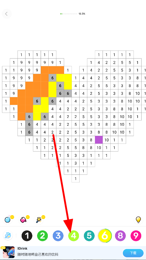 1、數(shù)字識色填涂:觀察畫布上每個區(qū)域的數(shù)字提示,在調(diào)色板找到對應(yīng)顏色進(jìn)行填涂,通過識別數(shù)字與顏色的對應(yīng)關(guān)系,逐步完成整體像素畫。