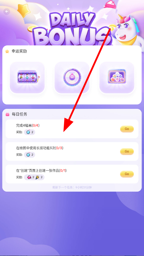 4、還可完成每日任務(wù),像完成指定數(shù)量的畫作等,完成任務(wù)后能獲取獎勵,這些獎勵可用于解鎖更多圖案或工具,豐富填色體驗(yàn)。