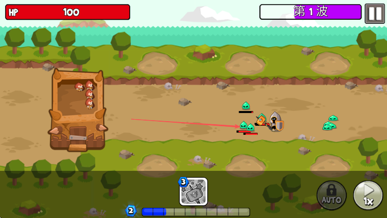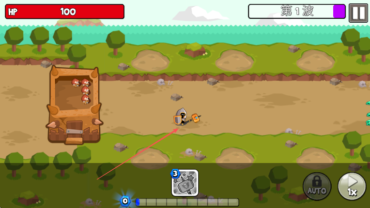 1、進(jìn)入游戲查看HP100和第1波信息,操控箭頭所指角色向前移動(dòng)準(zhǔn)備迎敵。