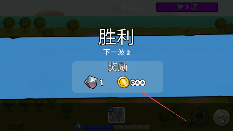 4、成功抵擋住第1波敵人進(jìn)攻后,獲取1個(gè)鉆石和300金幣獎(jiǎng)勵(lì),準(zhǔn)備迎接下一波敵人。