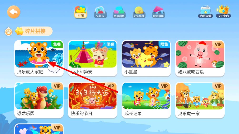 2、在拼圖選擇頁面,有各種不同主題的拼圖選項,比如貝樂虎大家庭小小印第安等,點(diǎn)擊想要挑戰(zhàn)的主題圖片進(jìn)入關(guān)卡。