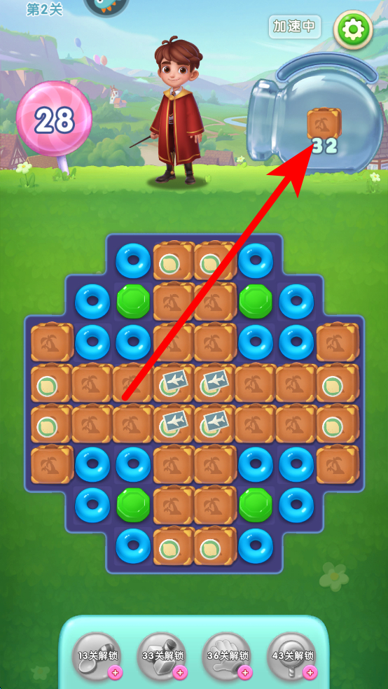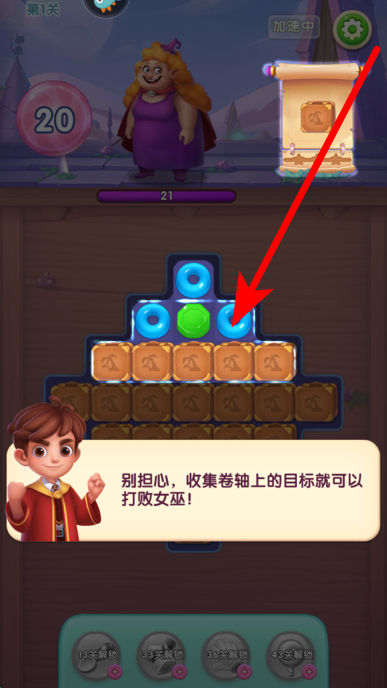 1、進(jìn)入游戲后,會(huì)看到帶有不同元素的界面,要仔細(xì)觀察元素分布,根據(jù)提示,消除相應(yīng)元素,推進(jìn)收集卷軸目標(biāo)的進(jìn)程,為打敗女巫做準(zhǔn)備。