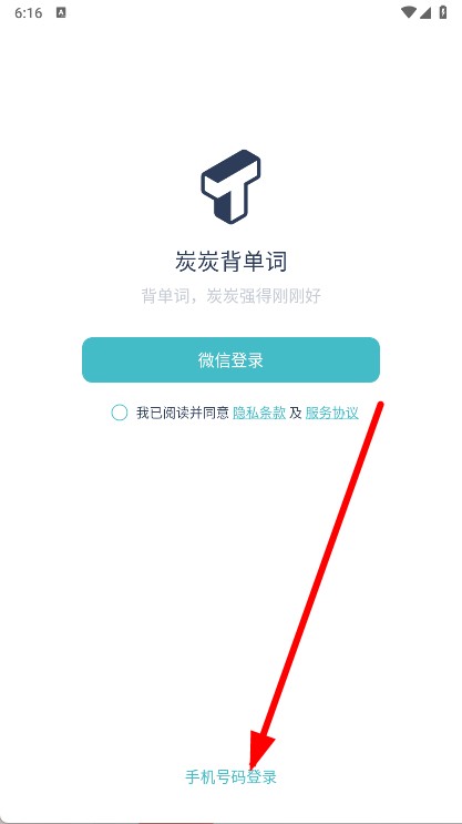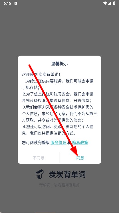 1、打開炭炭背單詞APP,在溫馨提示頁(yè)面點(diǎn)擊同意。