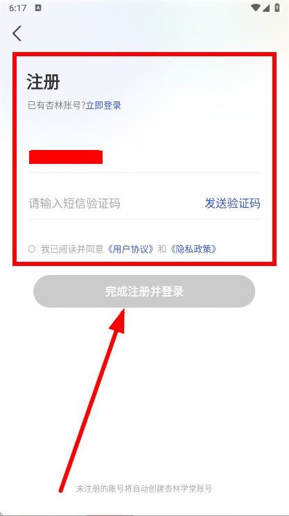 4、在新頁面輸入短信驗證碼,勾選同意后,點擊完成注冊并登錄按鈕。