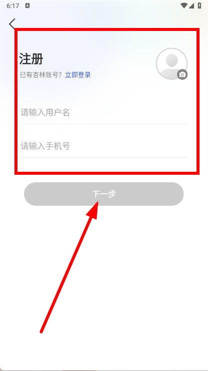 3、進入注冊頁面,輸入用戶名、手機號,點擊下一步。
