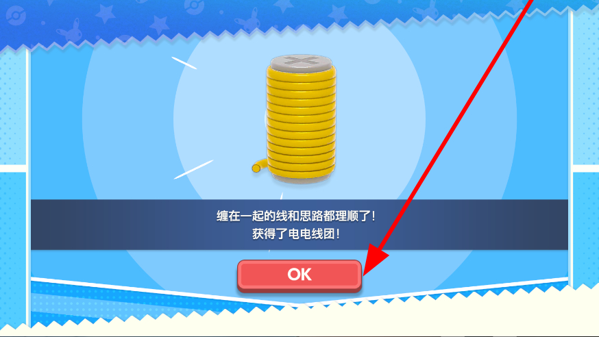 4、成功完成解謎后,會獲得道具,如電電線團等,獲得道具后點擊OK,這些道具可用于后續(xù)冒險,助力更好地探索與互動。