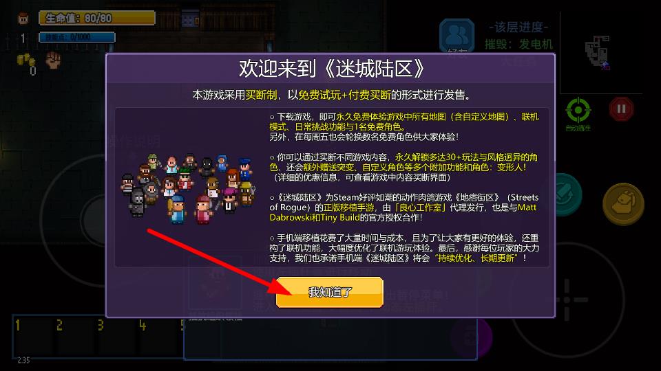 2、點(diǎn)擊我知道了的按鍵,可關(guān)閉游戲說明彈窗,正式的進(jìn)入游戲的場(chǎng)景,查看環(huán)境。