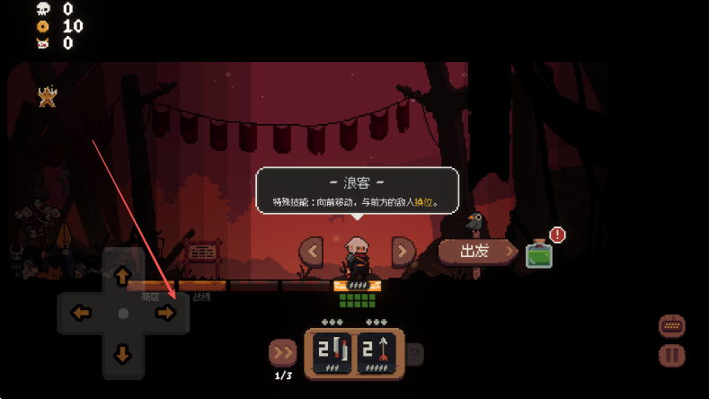 1、在初始界面通過左側(cè)方向鍵移動(dòng)選擇浪客角色,了解其特殊技能后點(diǎn)擊出發(fā)。
