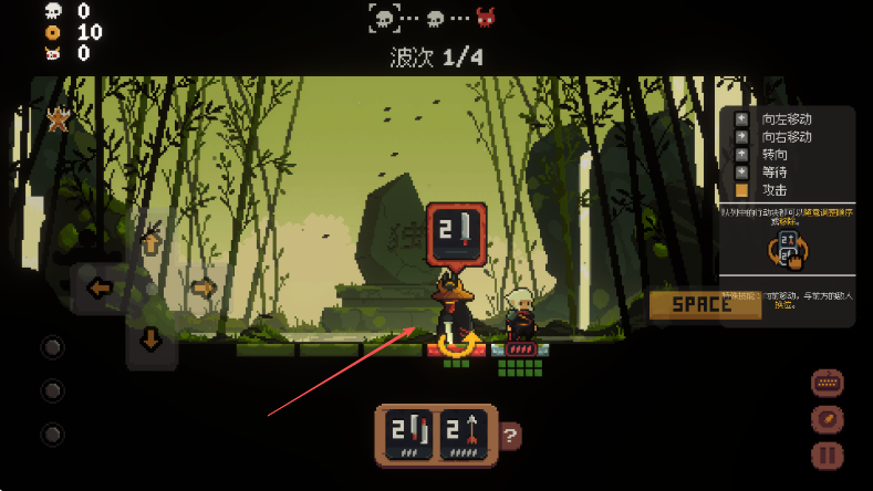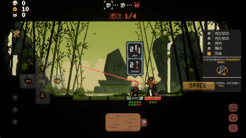 2、進(jìn)入戰(zhàn)斗界面,留意上方波次1/4提示,操控角色靠近敵人準(zhǔn)備攻擊。