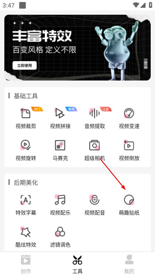 2、在工具頁面,若要使用萌趣貼紙功能,可點(diǎn)擊萌趣貼紙。