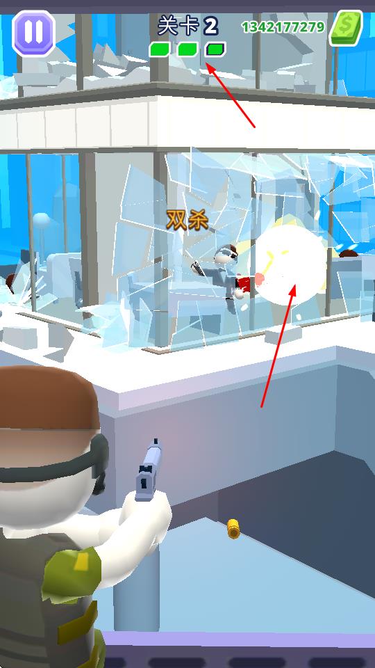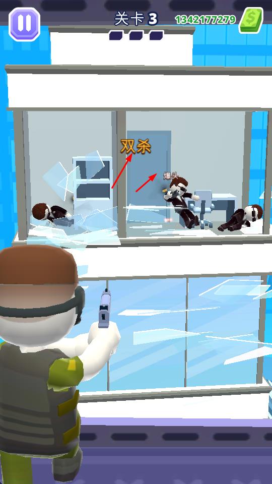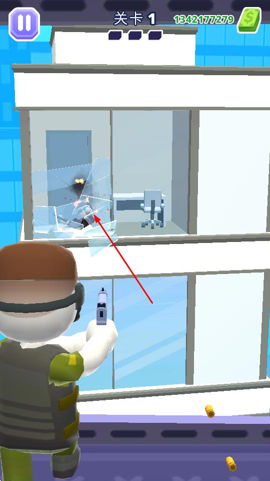 1、從關(guān)卡1開始,操控角色使用槍械射擊目標(biāo),打破玻璃等障礙物,攻擊敵人。