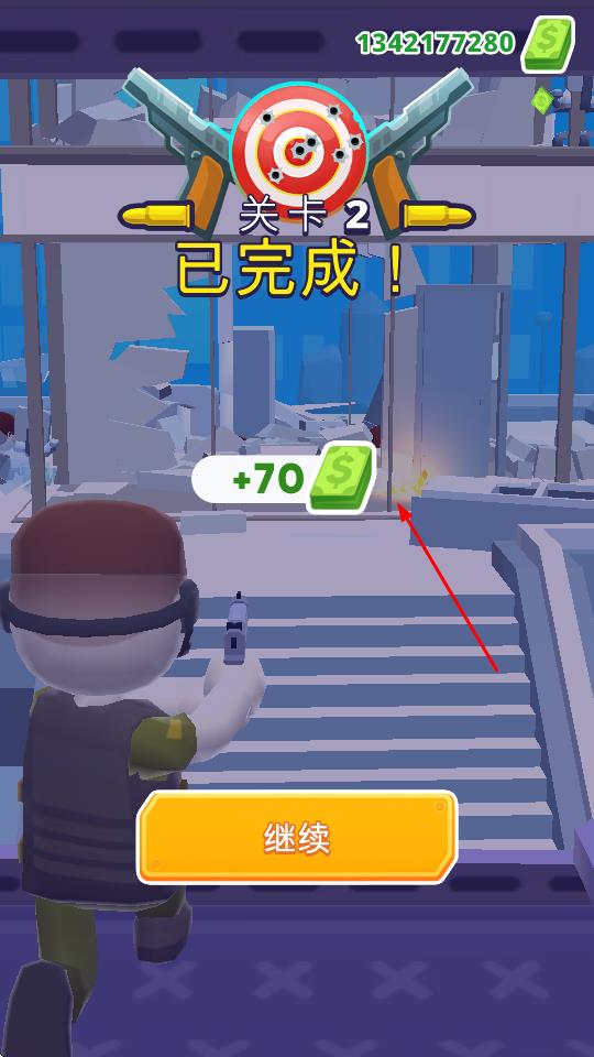 3、成功完成關(guān)卡后,會(huì)顯示關(guān)卡2已完成,并獲得金錢獎(jiǎng)勵(lì),點(diǎn)擊繼續(xù)進(jìn)入下一關(guān)。