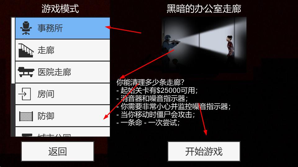 1、選擇游戲模式,如事務(wù)所、走廊等,然后點(diǎn)擊開始游戲,進(jìn)入對應(yīng)場景。