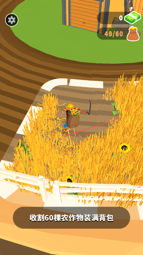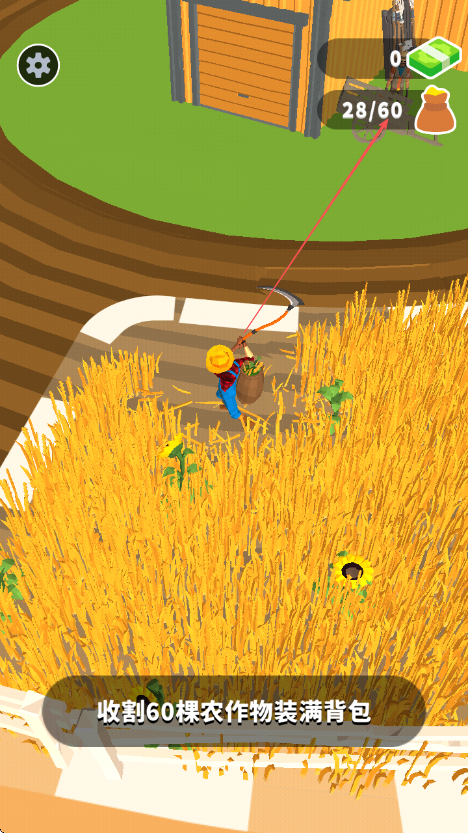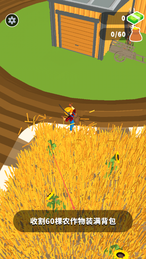 2、在麥田中移動,持續(xù)收割農作物,留意屏幕右上方顯示的已收割數(shù)量如28/60。