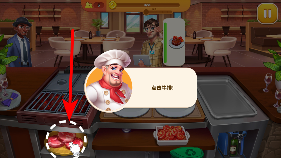1、根據(jù)廚師提示,點擊烤架下方的牛排,準(zhǔn)備進(jìn)行烹飪操作。