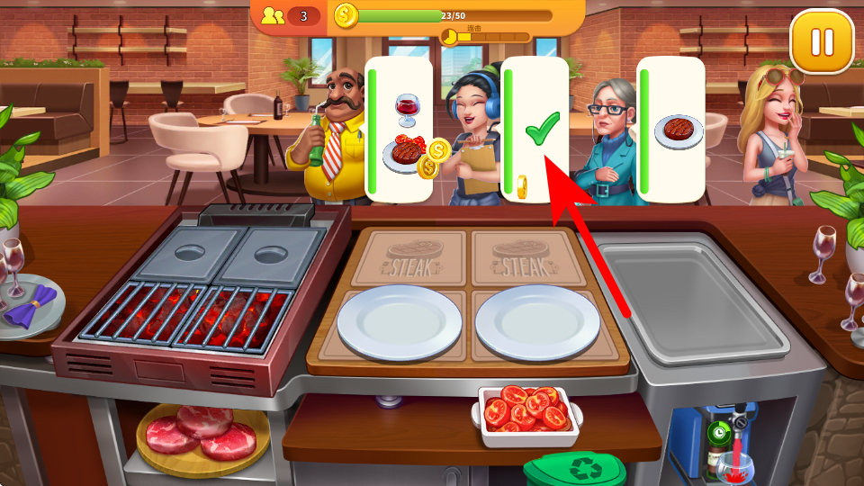 3、及時處理每位顧客的訂單,當(dāng)訂單完成時會出現(xiàn)綠色打鉤標(biāo)志,同時能獲得金幣獎勵。