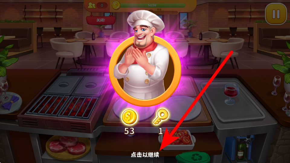 4、當(dāng)關(guān)卡結(jié)束,出現(xiàn)廚師形象和點擊以繼續(xù)提示時,點擊該區(qū)域可繼續(xù)游戲并獲取金幣和鑰匙獎勵。
