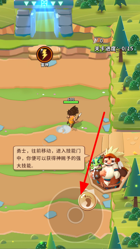 2、點擊移動按鈕,操控角色往前移動,根據(jù)場景提示,進入技能門等區(qū)域,獲取神賜予的強大技能,為后續(xù)戰(zhàn)斗做準(zhǔn)備。