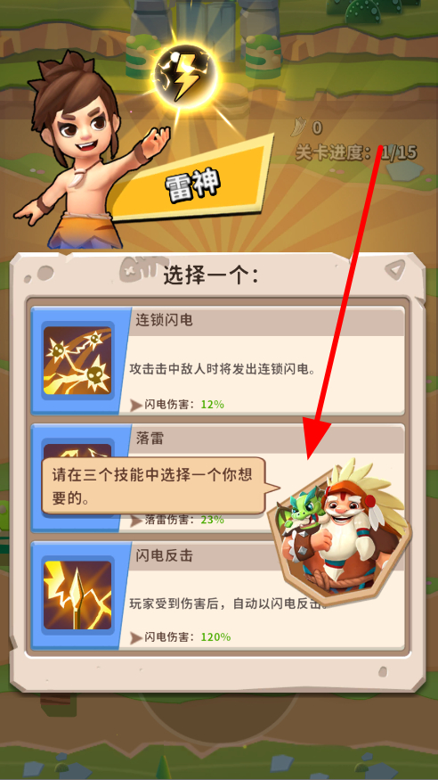 4、技能選擇,連鎖閃電落雷閃電反擊等技能中,挑選一個想要的技能,增強角色的戰(zhàn)斗能力,更好地應(yīng)對地牢中的挑戰(zhàn)。