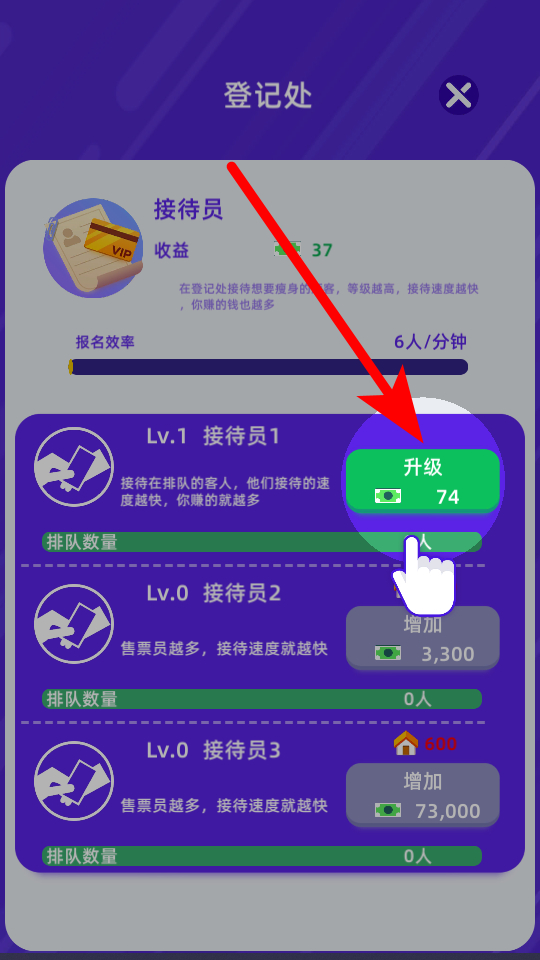 1、在登記處,優(yōu)先點擊升級按鈕升級接待員,提升接待速度以增加收益。