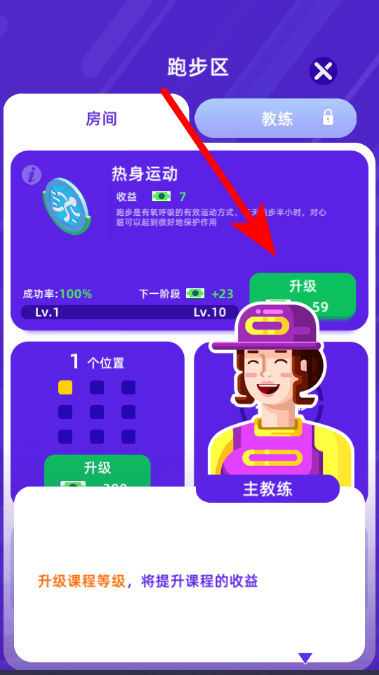 2、進入跑步區(qū),點擊熱身運動對應(yīng)的升級按鈕,提升課程等級來增加收益。