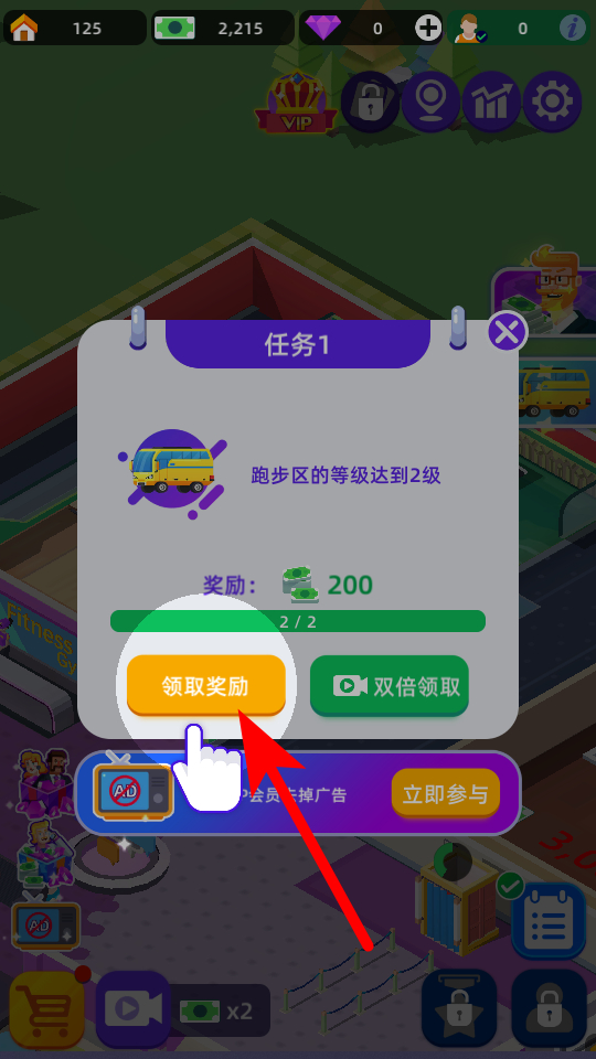 3、完成跑步區(qū)的等級達到兩級任務(wù)后,點擊領(lǐng)取獎勵按鈕,獲取兩百獎勵。