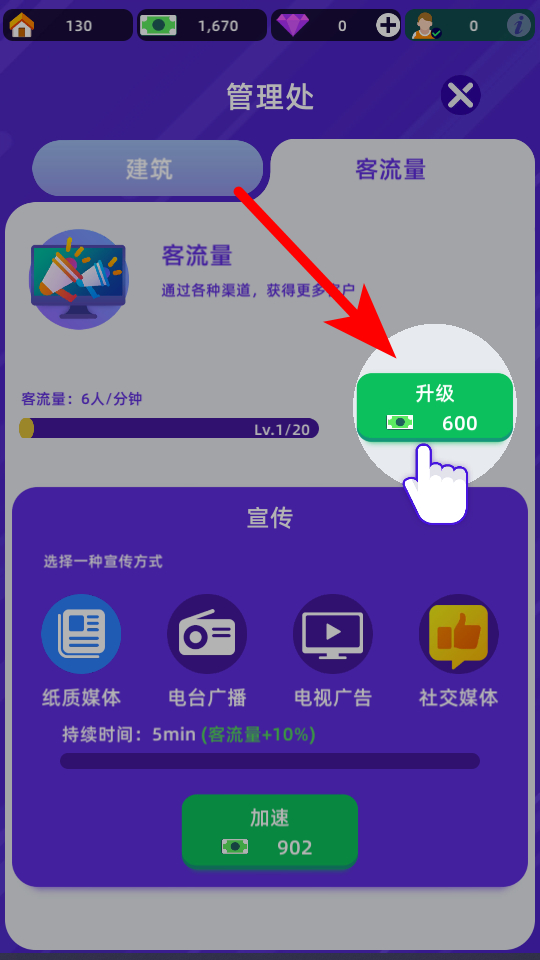 4、在管理處,點擊客流量旁的升級按鈕,花費六百提升客流量等級,吸引更多客戶。