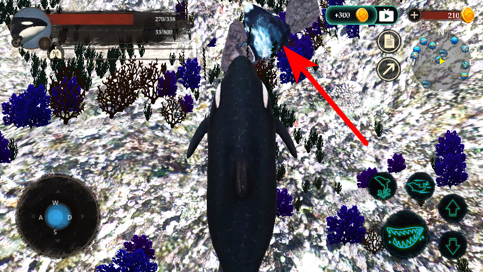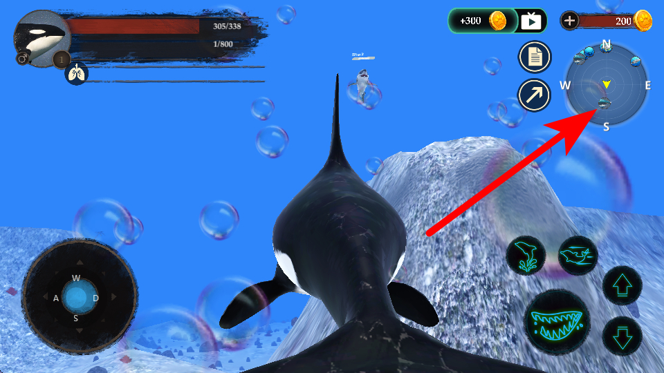 1、利用右上角的地圖,查看目標位置,朝著有其他海洋生物的區(qū)域移動,尋找互動或捕獵機會。