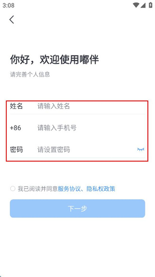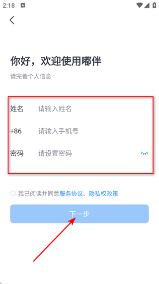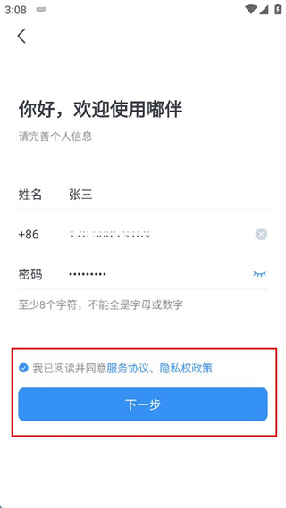2、完善個(gè)人信息,輸入姓名、手機(jī)號(hào)、設(shè)置密碼。