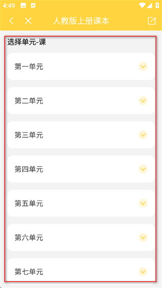 4、進(jìn)入人教版上冊課本頁面后,可選擇單元-課進(jìn)行學(xué)習(xí)。