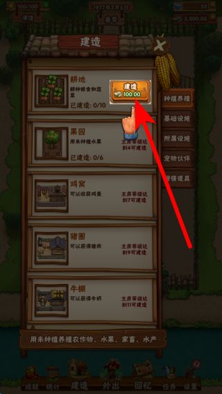 1、進(jìn)入游戲后,可進(jìn)入建造界面,花費(fèi)相應(yīng)貨幣建造耕地,耕地能用來(lái)種植更多糧食和蔬菜,助力小院生產(chǎn)。。