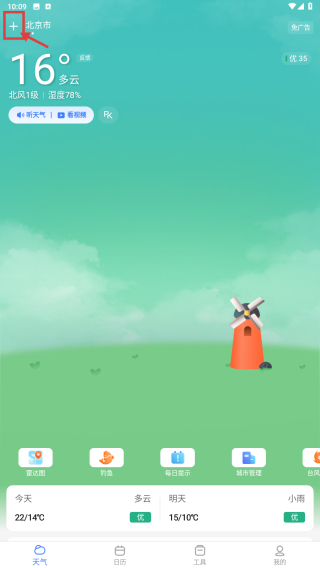 1、打開天氣APP,點擊左上角加號按鈕,進入城市搜索頁面。